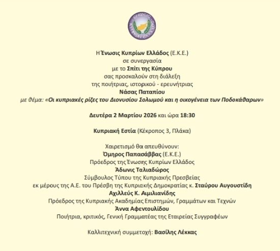Κυπριακή Εστία – Δευτέρα 2 Μαρτίου 2026 – 18:30 -Διάλεξη Νάσας Παταπίου: “Οι Κυπριακές ρίζες του Διονυσίου Σολωμού και η οικογένεια των Ποδοκάθαρων”