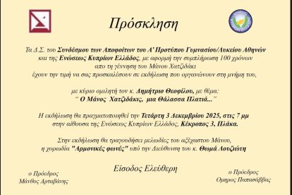 ΑΡΧΙΚΗ • ΔΙΑΦΟΡΑ • ΕΚΔΗΛΩΣΕΙΣ ΕΚΕ – ΕΚΔΗΛΩΣΗ 100 ΧΡΟΝΙΑ ΑΠΟ ΤΗ ΓΕΝΝΗΣΗ ΤΟΥ ΜΑΝΟΥ ΧΑΤΖΗΔΑΚΗ -ΚΥΠΡΙΑΚΗ ΕΣΤΙΑ -ΤΕΤΑΡΤΗ 03/12/2025 – 19:00 13/11/2025