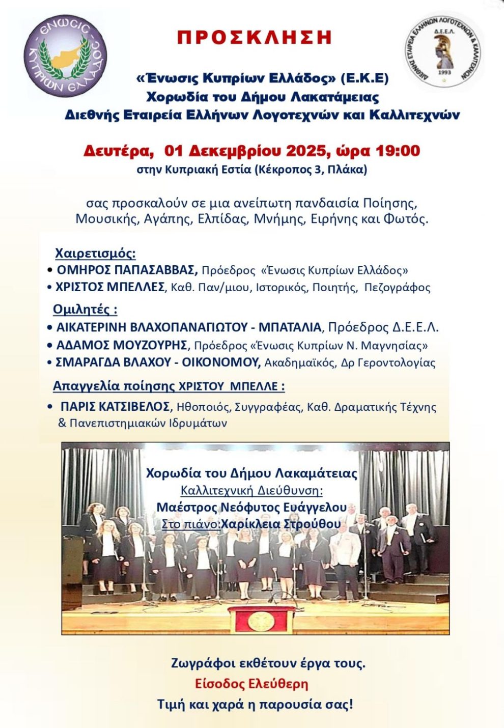 ΚΥΠΡΙΑΚΗ ΕΣΤΙΑ -ΕΚΔΗΛΩΣΗ: ΠΑΝΔΑΙΣΙΑ ΠΟΙΗΣΗΣ, ΜΟΥΣΙΚΗΣ, ΑΓΑΠΗΣ, ΕΛΠΙΔΑΣ, ΜΝΗΜΗΣ, ΕΙΡΗΝΗΣ, ΦΩΤΟΣ -ΔΕΥΤΕΡΑ 1 ΔΕΚΕΜΒΡΙΟΥ 2025 – 19:00