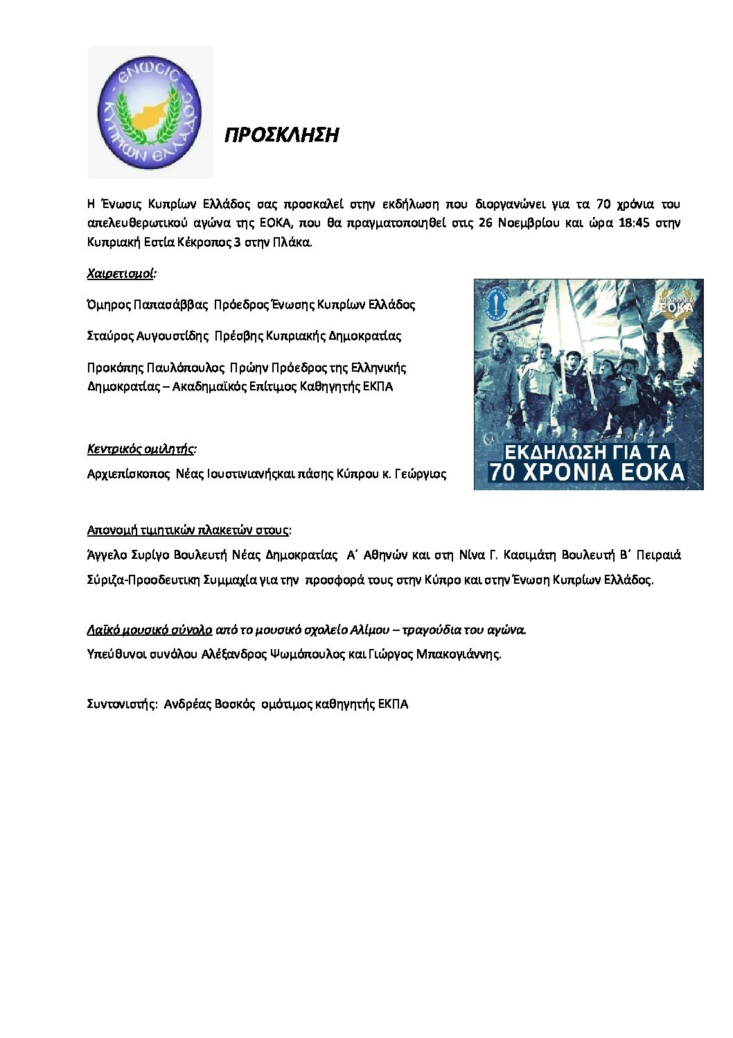 Επέτειος της 28ης Οκτωβρίου 1940 Η Κύπρος μαζί με την Ελλάδα στο “Όχι” Η Ένωσις Κυπρίων Ελλάδος τιμά την 28 Οκτωβρίου, την επέτειο του ιστορικού «Όχι» του ελληνικού λαού...