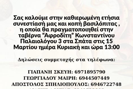 ΑΡΧΙΚΗ • ΔΙΑΦΟΡΑ • ΕΚΔΗΛΩΣΕΙΣ Σπάτα -Ταβερνα Αφροδίτη -15/03/2026 – 13:00 Συνεστίαση και κοπή πίτας ΕΚΕ 04/03/2026